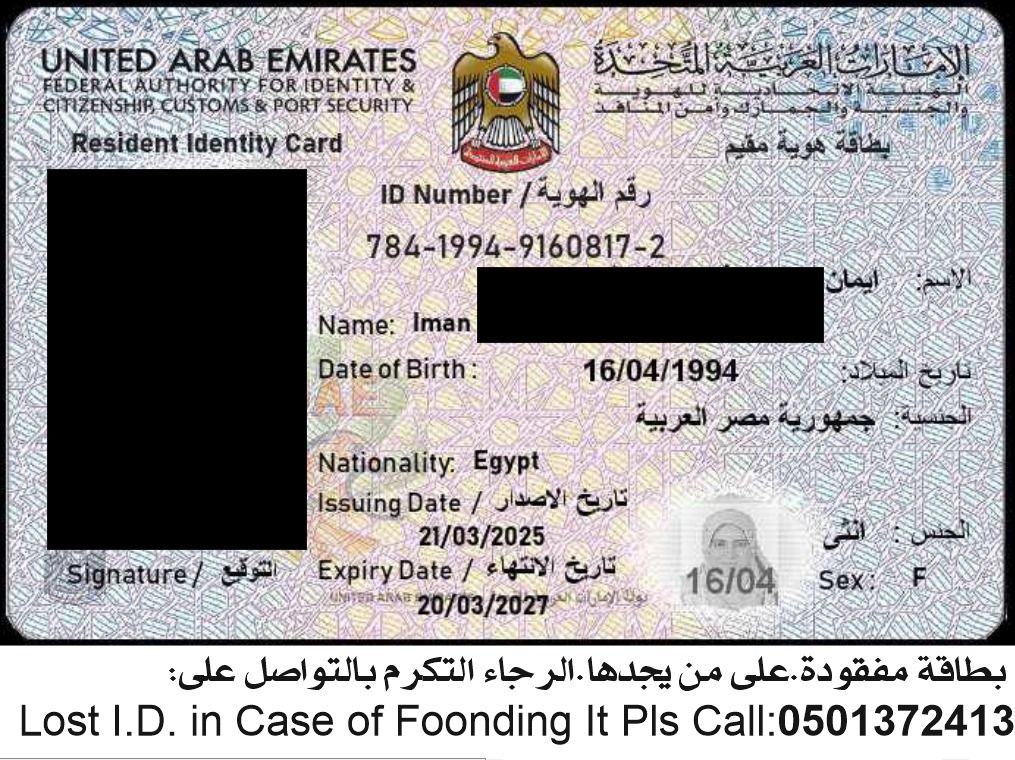 بطاقة هوية مفقودة. على من يجدها التكرم بالاتصال على Lost ID card. If found, please call