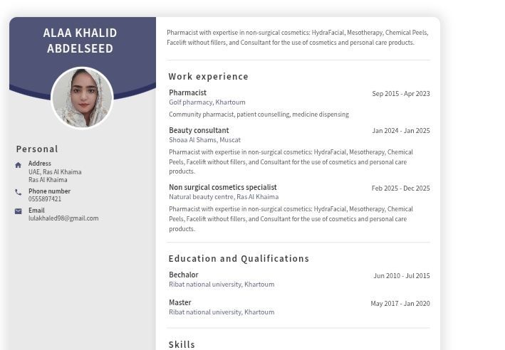 صيدلانية وخبرة في التجميل الغير جراحي (هيدرافيشيال ميزوثيرابي تقشير كيميائي شد الوجه بدون فيلر) والعناية بالبشرة لجميع أنواع البشرة متواجدة في إمارة رأس الخيمة