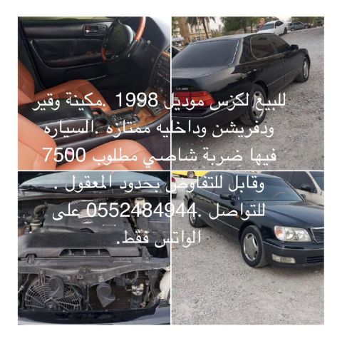 للبيع لكزس موديل 1998. المحرك والجير والدفريشن والداخلية ممتازة. السيارة فيها ضربة شاسيه. السعر: 7500 قابل للتفاوض ضمن حدود معقولة. للتواصل.
