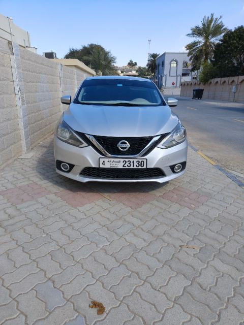 Nissan Sentra SV, four-cylinder 1800 cc, model 2017, American import, first owner in the UAE. Features include screen, camera, parking sensors, driving modes, fuel-saving system, air conditioning, refrigerator, spoiler, fingerprint, and engine start. Vehicle mileage: 77,000 miles.
