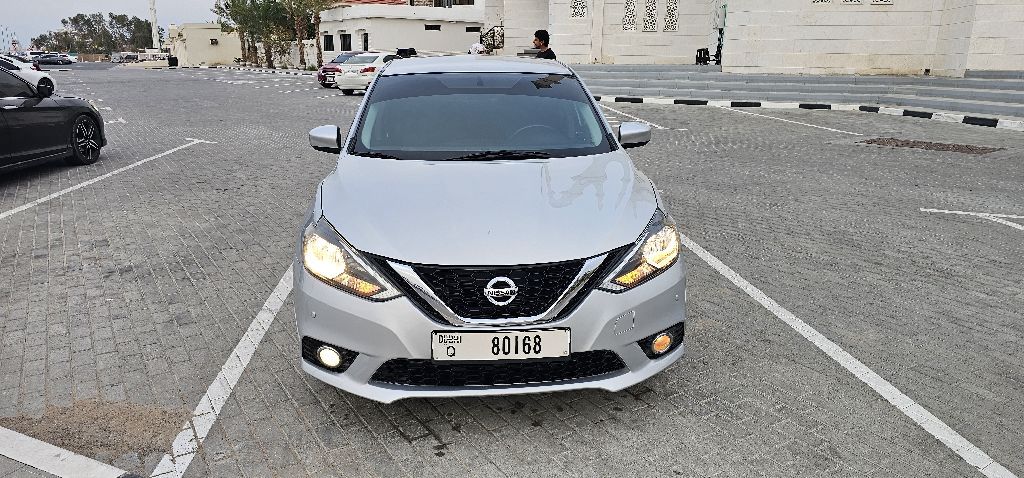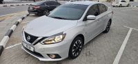 Nissan Sentra SV, four-cylinder 1800 cc, model 2017, American import, first owner in the UAE. Features include screen, camera, parking sensors, driving modes, fuel-saving system, air conditioning, refrigerator, spoiler, fingerprint, and engine start. Vehicle mileage: 77,000 miles.