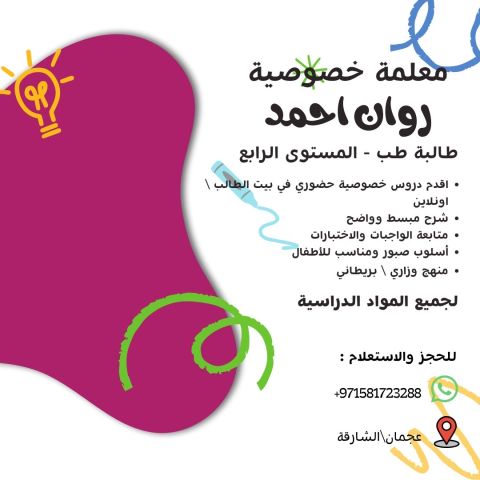 معلمة تدريس خصوصيه خبرة في التدريس دخل الدولة، في جميع المناهج والمنهج الوزاري. متخصصة في تأسيس وتقوية الدروس والمتابعة اليومية وحل الواجبات والتدريب علي الاختبارات والامتحانات. تدريس جميع المواد حضوري. ومساعده الطلاب على الفهم والاستيعاب. والشرح بطريقة سهلة ومبسطه في توصيل المعلومه لطالب. للتواصل رأس الخيمة