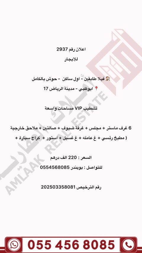 اعلان رقم 2937 للإيجار فيلا طابقين - أول ساكن - حوش بالكامل - الرياض 17 تشطيب VIP مساحات واسعة 6 غرف ماستر مجلس غرفة ضيوف صالتين ملاحق خارجية مطبخ رئيسي غرفة عاملة غرفة غسيل ستور كراج سيارة السعر 220 ألف درهم للتواصل بوبندر رقم الترخيص