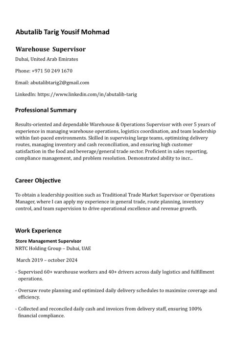 أبو طالب طارق يمتلك خبرة 6 سنوات ويبحث عن عمل في إدارة المستودعات والعمليات اللوجستية، وإدارة فرق العمل وخطوط الإمداد والتوزيع، ومتابعة المخزون، وتنظيم حركة التسليم، وإدارة السائقين وحركة التسليم