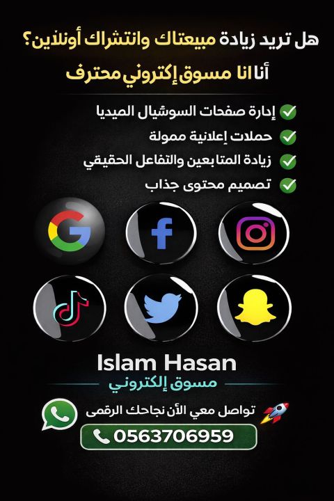 عايز مشروعك يكبر. عايز شغلك ينتشر. عايز تزود مبيعاتك وتوصل للعملاء الحقيقيين. أنا مسوق الكتروني وبساعدك توصل للعملاء الصح من خلال الاعلانات الممولة علي منصات التواصل الاجتماعي وبرامج التسويق من أول الاعلان لحد اتمام عملية البيع. تواصل معي وحقق نجاحك دلوقتي