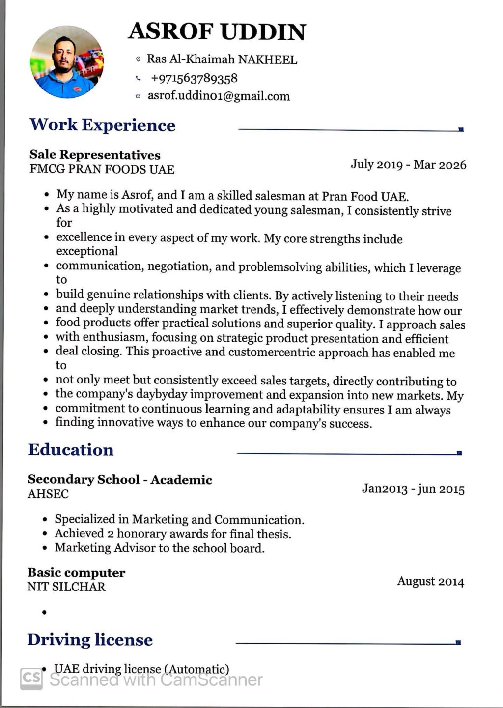 My Name is Asrof Uddin 7 year experience FMCG I have valid UAE driving license