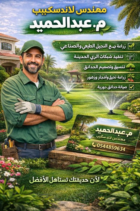 مهندس لاند سكيب - مهندس عبد الحميد متخصص في تنسيق وزراعة الفلل والحدائق بأعلى جودة وأفضل أسعار زراعة جميع أنواع النجيلة الطبيعية والصناعية تنفيذ شبكات الري الحديثة (تنقيط - رشاشات) تصميم وتنسيق حدائق الفلل والاستراحات زراعة أشجار، نخيل، شجيرات وزهور صيانة حدائق بشكل دوري واحترافي خبرة عملية شغل نظيف ومضمون التزام بالمواعيد أسعار تنافسية للتواصل والاستفسار