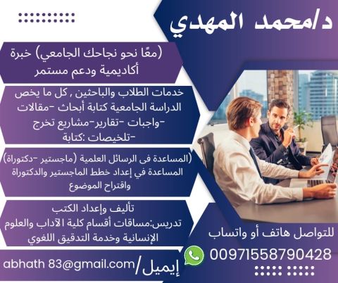 Dr. Mohamed Al - Mahdi Academic services for students and researchers, including research writing, articles, assignments, reports, graduation projects, summaries, and academic editing. Support for Master’s and PhD theses research proposal preparation and topic selection. Book authoring and preparation. Teaching courses in the Faculty of Arts and Humanities