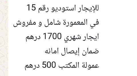للإيجار استوديو خلف الكورنيش شامل الماء والكهرباء الإيجار الشهري 1200 درهم رسوم المكتب للتواصل
