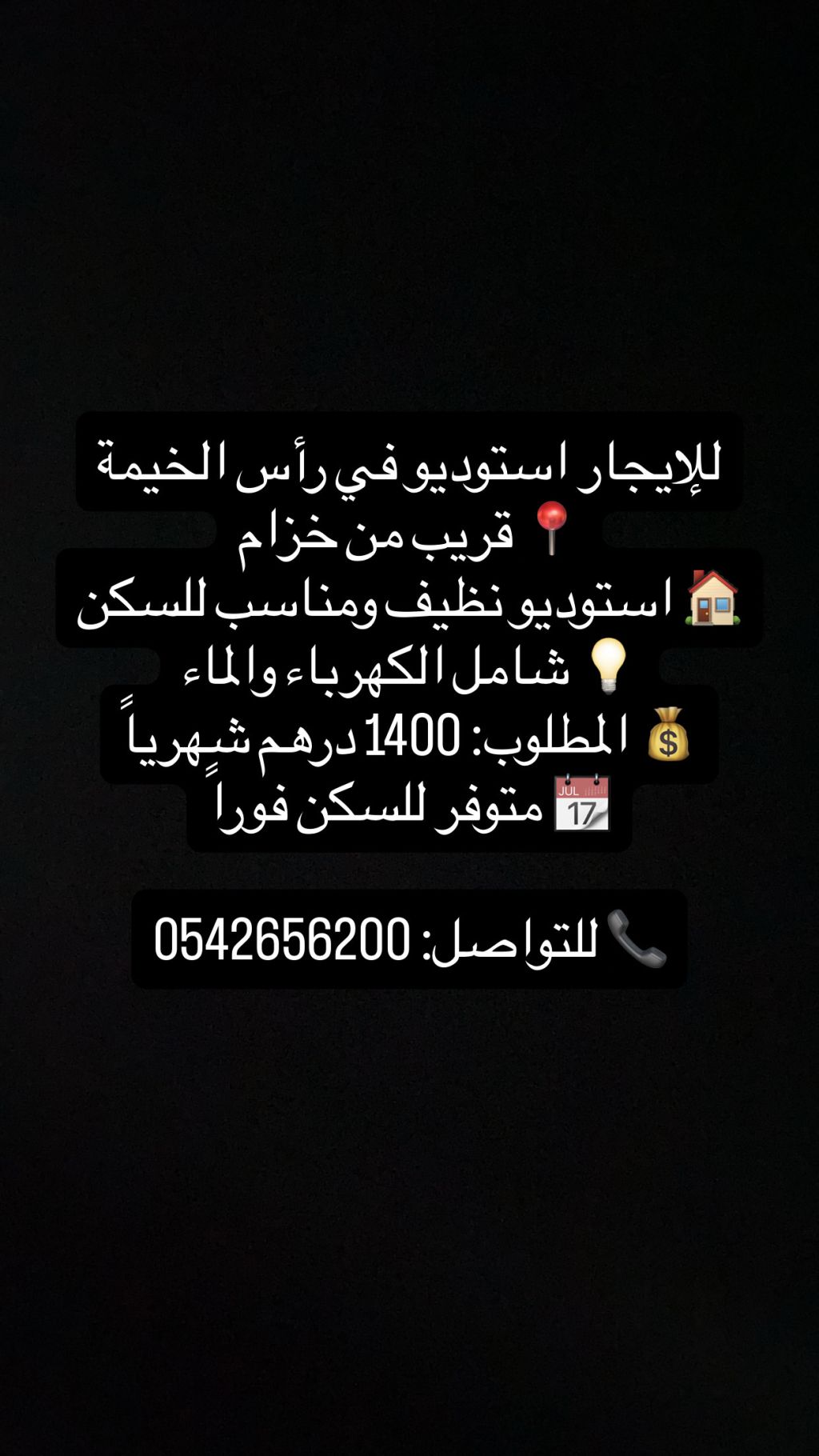 للإيجار استوديو في رأس الخيمة قريب من خزام استوديو نظيف ومناسب للسكن شامل الكهرباء والماء المطلوب 1400 درهم شهريا متوفر للسكن فورا للتواصل