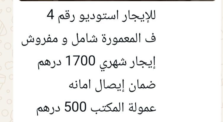 للإيجار استوديو رقم 4 في المعمورة شامل ومفروش إيجار شهري 1700 درهم ضمان ايصال أمانة عمولة المكتب 500 درهم