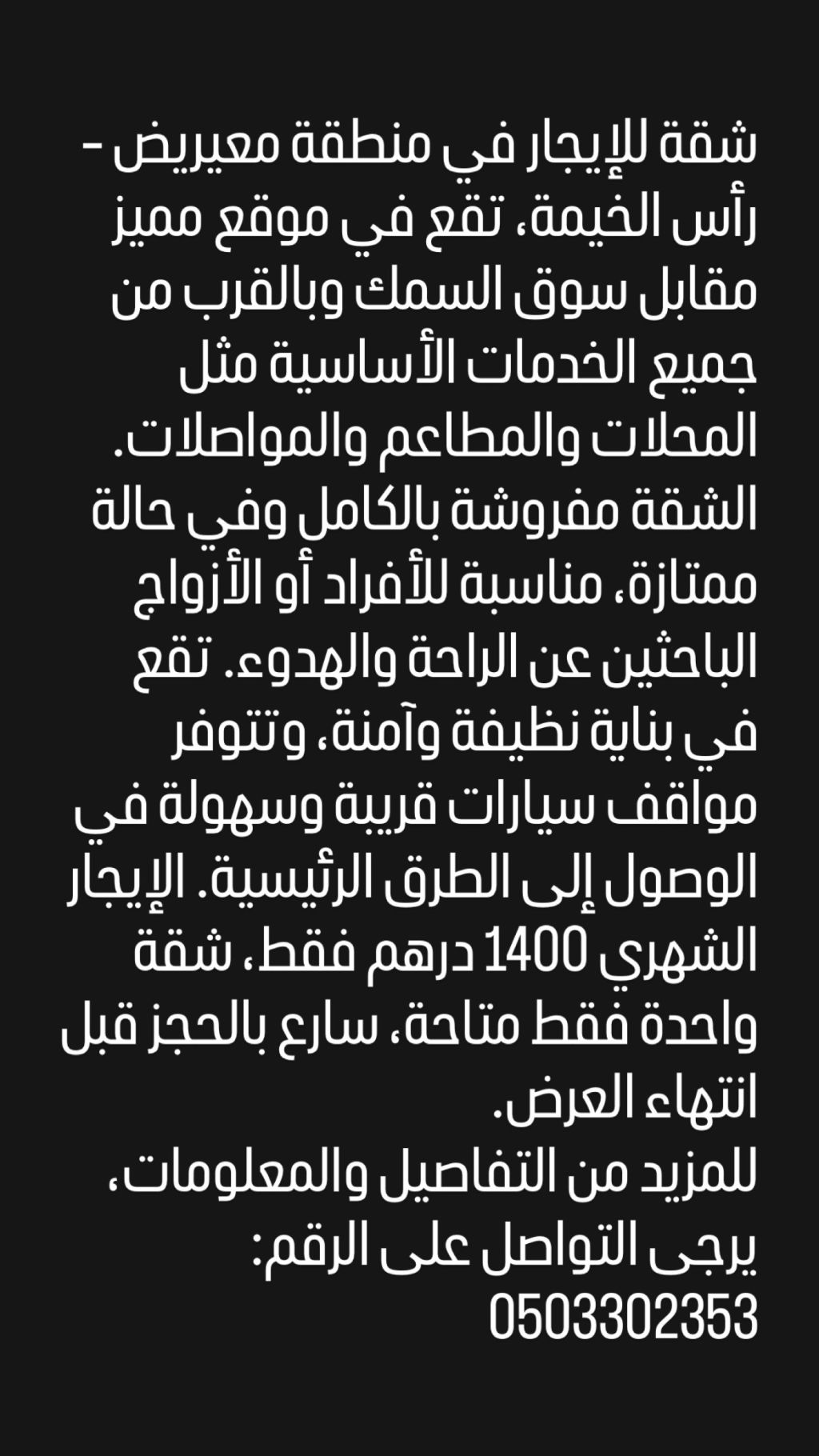 Fully furnished apartment for rent in Maireedh, Ras Al-Khaimah. Excellent location opposite the fish market, close to shops, restaurants, and public transport. Clean and secure building with easy access to main roads. monthly rent AED1400 only. One apartment available. For more details, contact