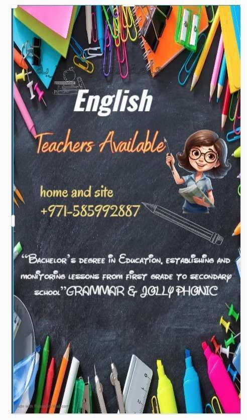أستاذة لغة انجليزية تأسيس ومتابعة الدروس جميع المناهج وزاري أمريكي بريطاني طريقة الجولي فنكس وجرامر وأدب انجليزي متوفرة في رأس الخيمة (النخيل) حضوري