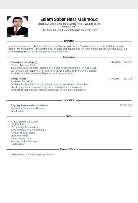 أنا اسمي اسلام ومحتاج عمل كمساعد شيفات وأنا لدي خبرة في المطاعم وفي مجال الفنادق ومعيا CV