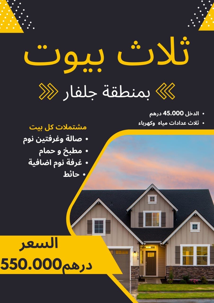 استثمارك جاهز من أول يوم للبيع ثلاث بيوت بثلاث عدادات نظامية (زاوية) بمنطقة جلفار المساحة الكلية 3576 ق م كل بيت مكون من غرفتين نوم، صالة، مطبخ، حمام الدخل 45000 درهم فقط بسعر 550000 درهم
