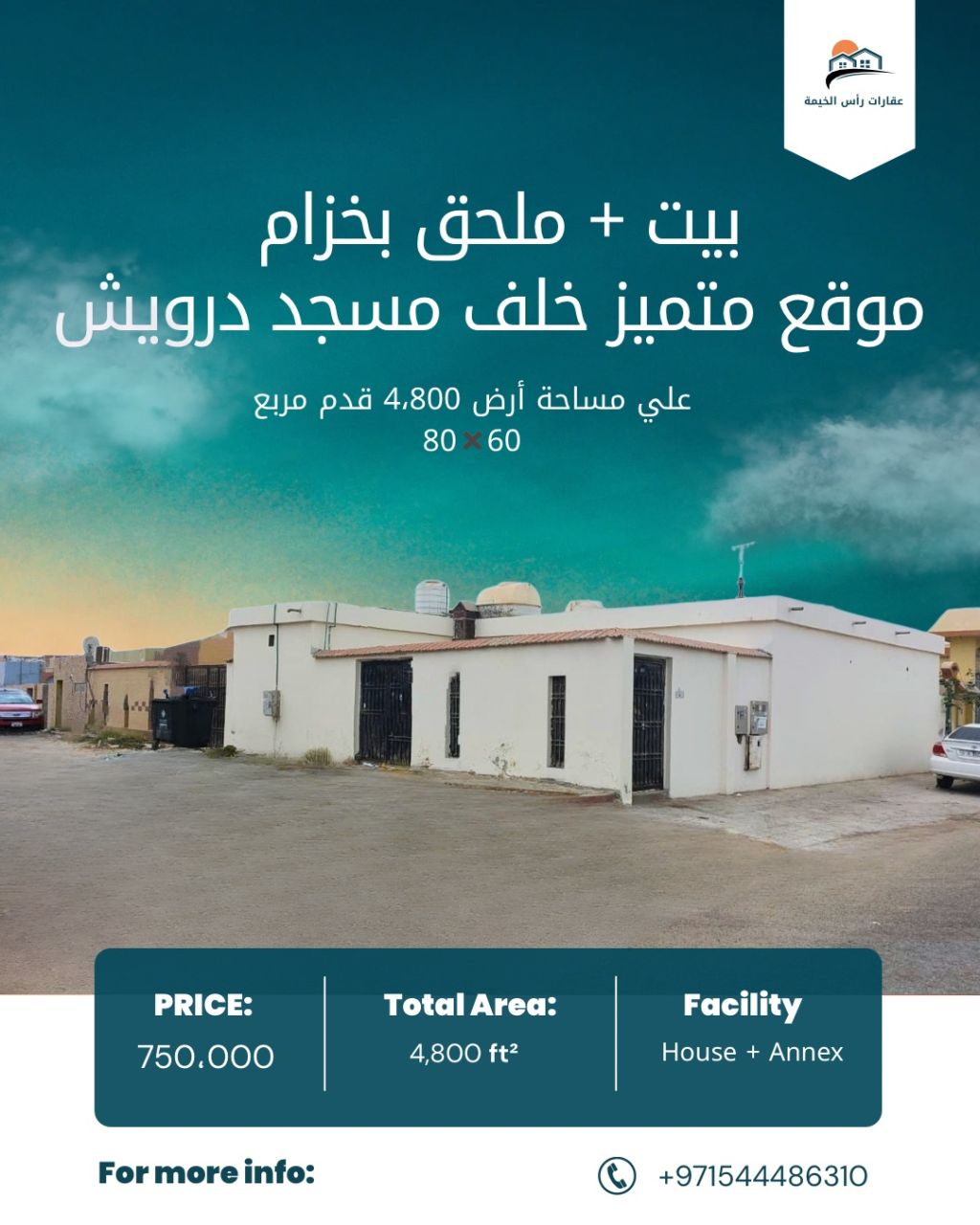 للبيع بيت + ملحق بمنطقة خزام موقع مميز خلف مسجد درويش المساحة 4800 قدم مربع (60*80) البيت مكون من ثلاث غرف نوم، صالة والملحق مكون من غرفتين، صالة السعر 750000 درهم