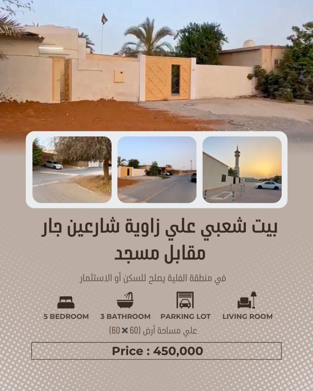 بيت شعبي بمنطقة الفلية يصلح للسكن أو الاستثمار علي زاوية شارعين جار ومقابل مسجد مباشرة المساحة (60*60) مكون من 5 غرف نوم، صالة، 3 حمامات، مطبخ، حوش مؤجر بدخل 25000 درهم السعر المطلوب 450000 قابل للتفاوض