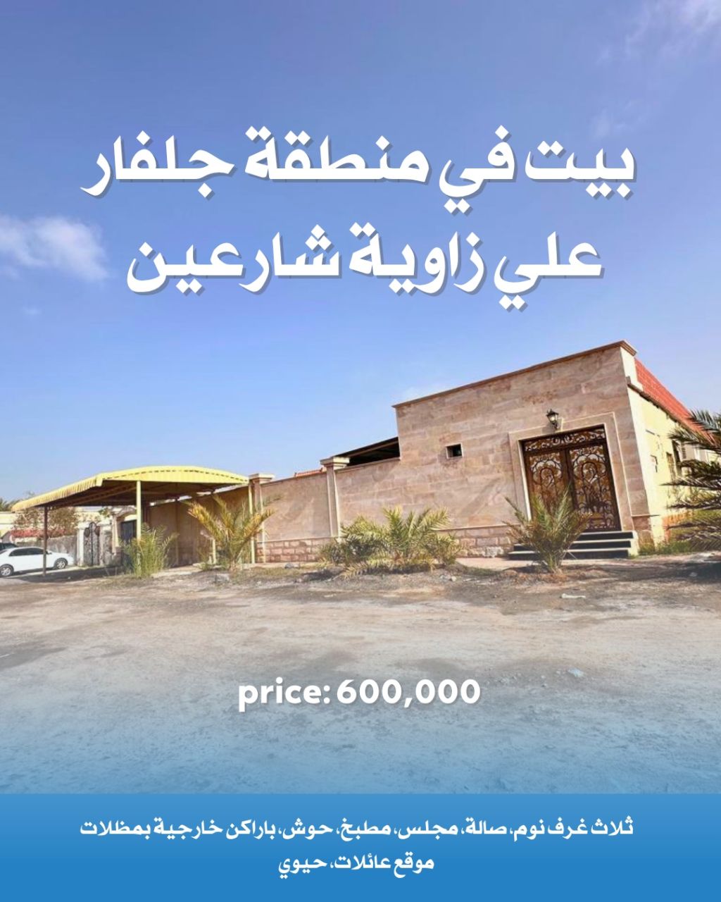 بيت للبيع في إمارة رأس الخيمة بمنطقة جلفار علي زاوية شارعين بموقع حيوي المساحة (82*82) مكون من ثلاث غرف نوم، صالة، مجلس، مطبخ، حوش، مواقف خارجيه بمظلات السعر 600000 درهم
