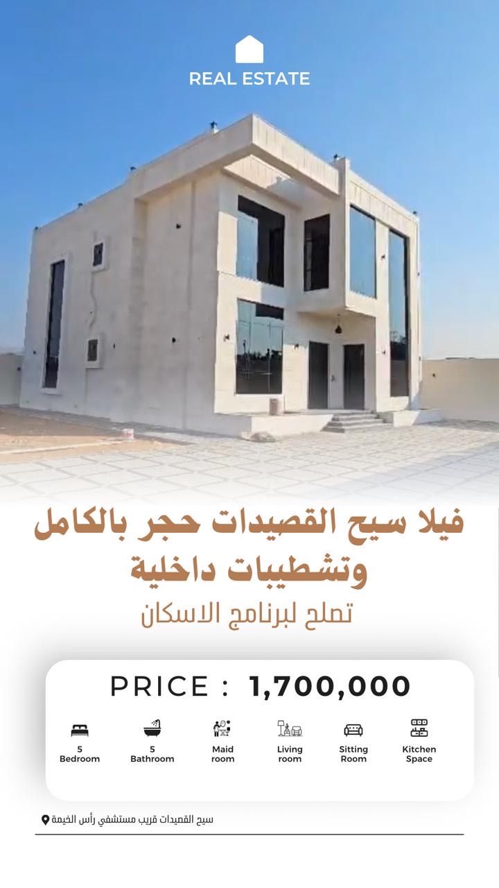 فيلا حجر بالكامل تصلح لبرنامج الاسكان في إمارة رأس الخيمة - سيح القصيدات - قريب مستشفى رأس الخيمة المساحة 10000 قدم مربع (100*100) الفيلا مكونة من 5 غرف نوم ماستر - صالة - مجلس - مطبخ - غرفة عاملة الفيلا حجر بالكامل ومجهزة بالديكورات تصلح للشراء عن طريق (الكاش - التمويل البنكي - برنامج الاسكان) سعر البيع 1700000 درهم