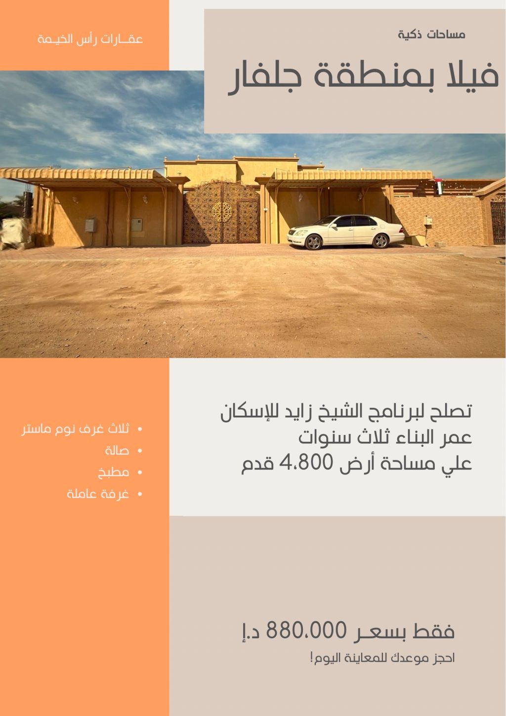 فيلا جديدة بمنطقة جلفار تلصح لبرنامج الشيخ زايد للاسكان المساحة (60*80) عمر البناء ثلاث سنوات مكونة من ثلاث غرف نوم ماستر، صالة، مطبخ، غرفة عاملة، تصلح للشراء عن طريق (الكاش - البنك - الاسكان) فقط بسعر 880000 د إ
