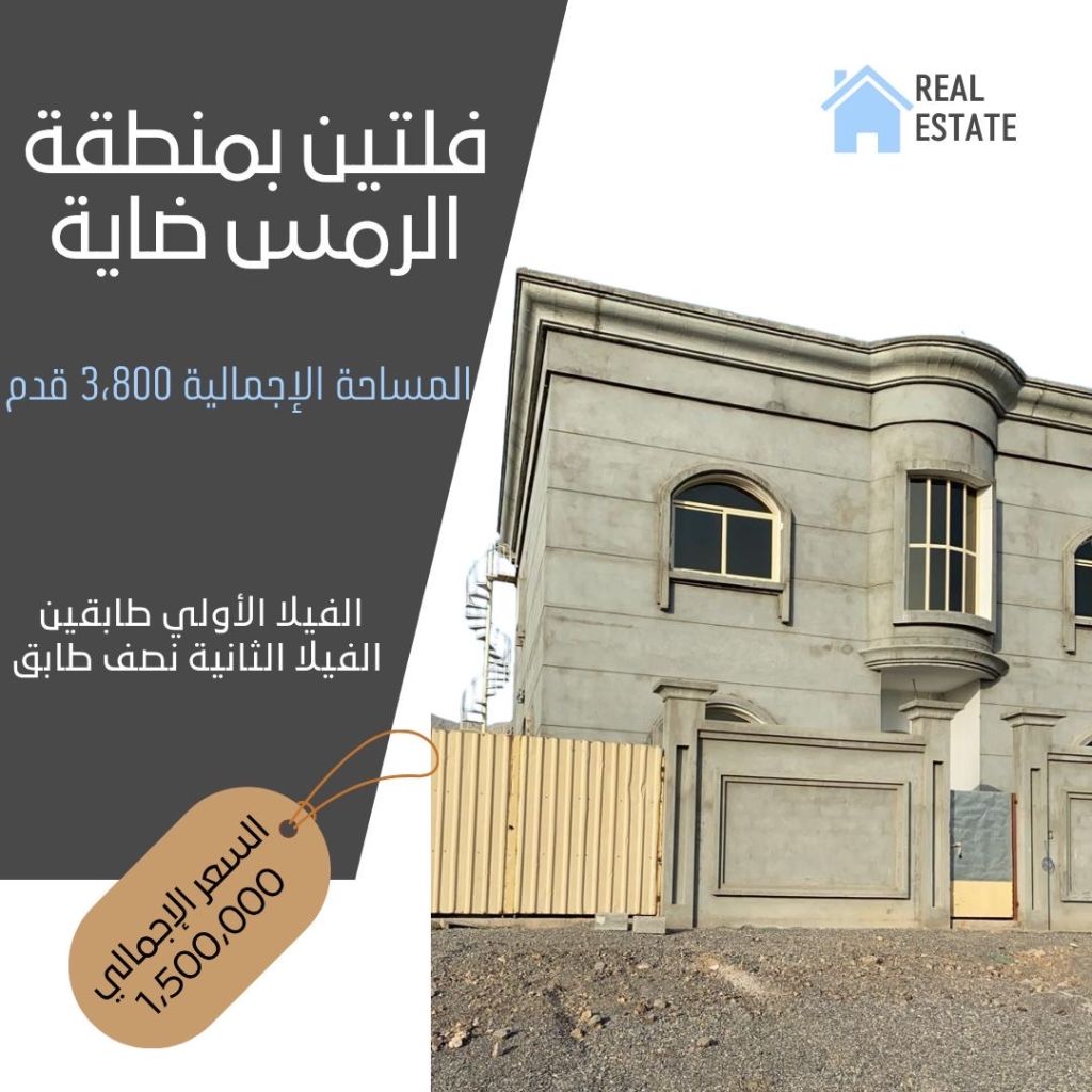فلتين في الرمس - ضاية المساحة الاجمالية 3800 قدم مربع الفيلا الأولى طابقين - نسبة الانجاز 87 (فقط التشطيبات النهائية متبقية) الفيلا الثانية نصف طابق السعر 1500000 درهم قابل للتفاوض للمشتري الجاد