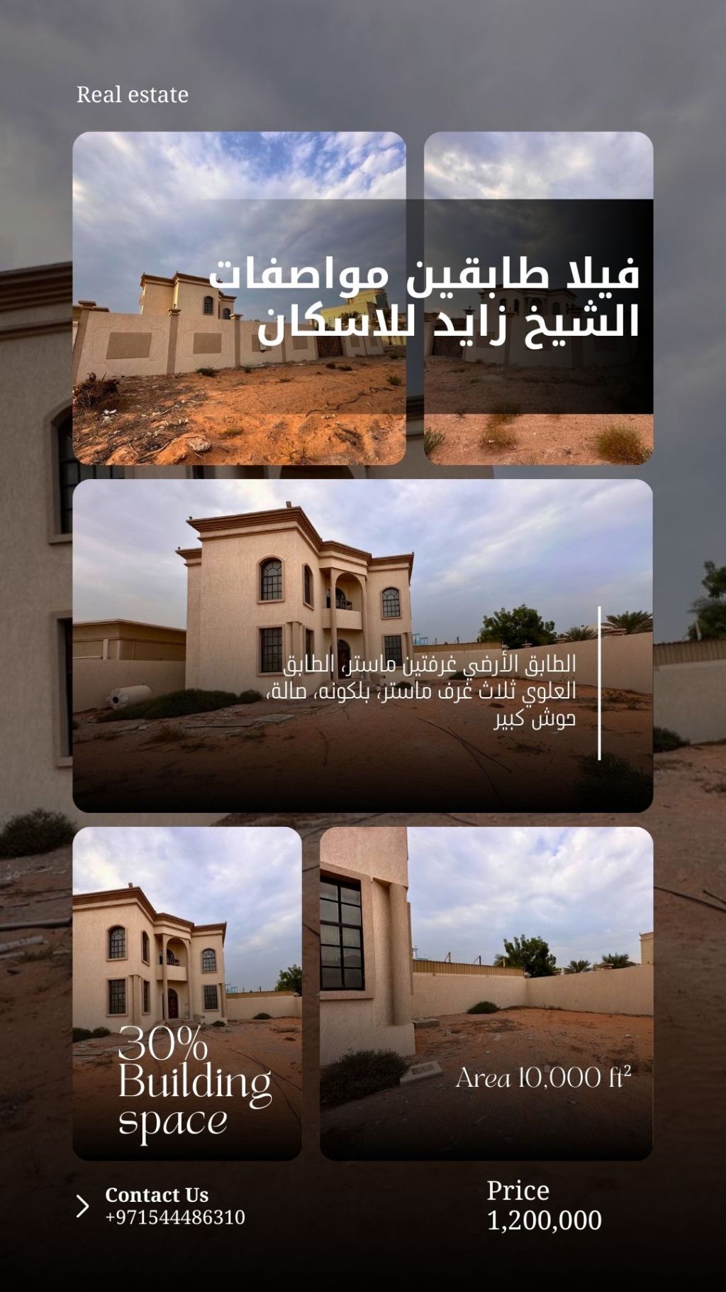 فيلا جديدة مواصفات برنامج الشيخ زايد للاسكان مساحة الأرض 10000 قدم مربع (100*100) مساحة البناء 30% مكونة من 5 غرف نوم ماستر، صالة، بلكونه، حوش كبير. فقط بسعر 1200000 د إ