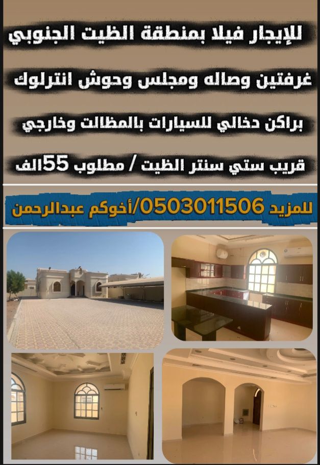 للإيجار فيلا بمنطقة الظيت الجنوبي عبارة عن غرفتين وصالة ومجلس بمساحة كبير حوش انترلوك ومواقف داخلية بالمظالت لسيارة ومواقف خارجي مع المكيفات 55 ألف احجز الآن