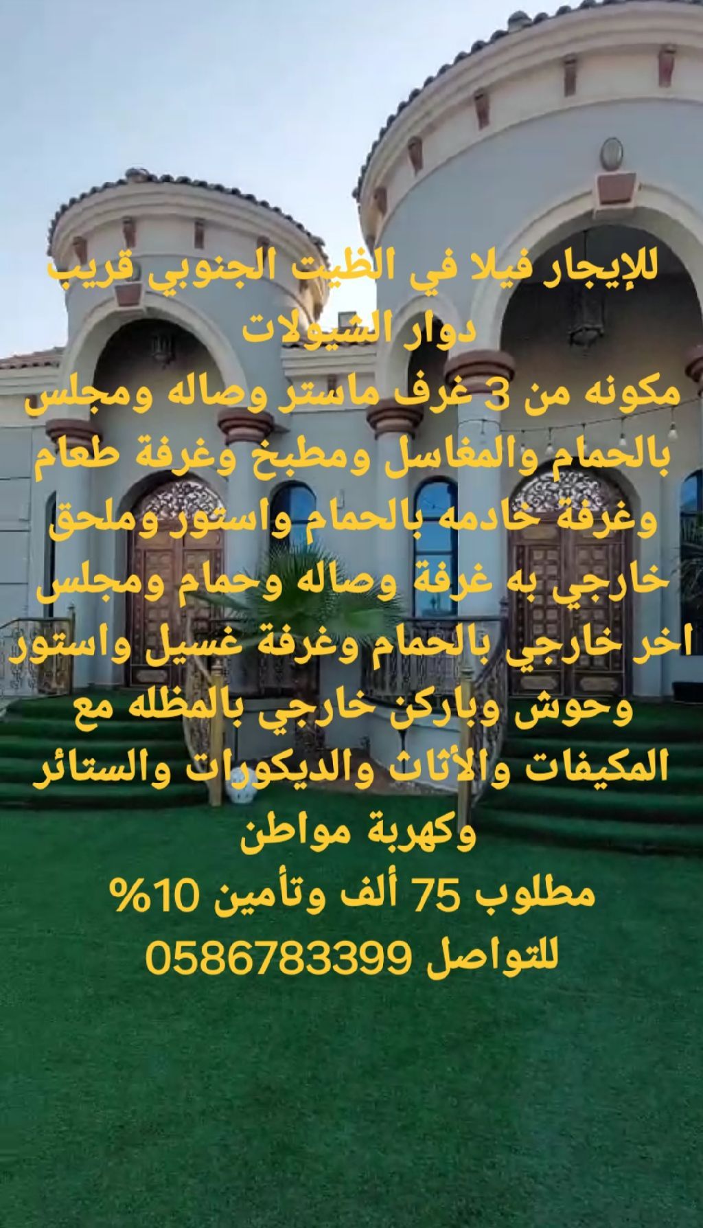 للإيجار فيلا في الظيت الجنوبي قريب دوار الشيولات مكونة من 3 غرف ماستر وصالة ومجلس بالحمام والمغاسل ومطبخ وغرفة طعام وغرفة خادمة بالحمام وستور وملحق خارجي به غرفة وصالة وحمام ومجلس آخر خارجي بالحمام وغرفة غسيل وستور وحوش وموقف خارجي بالمظلة مع المكيفات والأثاث والديكورات والستائر وكهرباء مواطن مطلوب 75 ألف وتأمين 10%