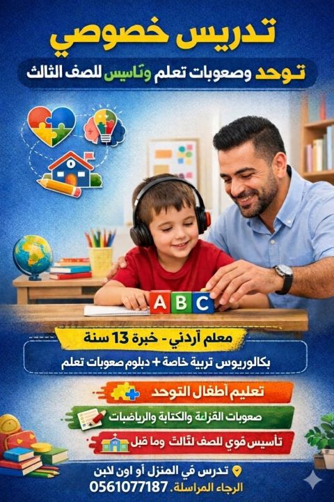 مدرس خصوصي أردني - توحد وصعوبات تعلم وتأسيس للمرحلة الابتدائيه، خبرة 13 سنة بكالوريوس تربية خاصة + دبلوم صعوبات تعلم. الخدمات تعليم اطفال التوحد - صعوبات القراءة والكتابة والرياضيات - تأسيس قوي للصف الثالث وما قبل تدريس في المنزل أو اونلاين. للتواصل الرجاء الاتصال على الرقم