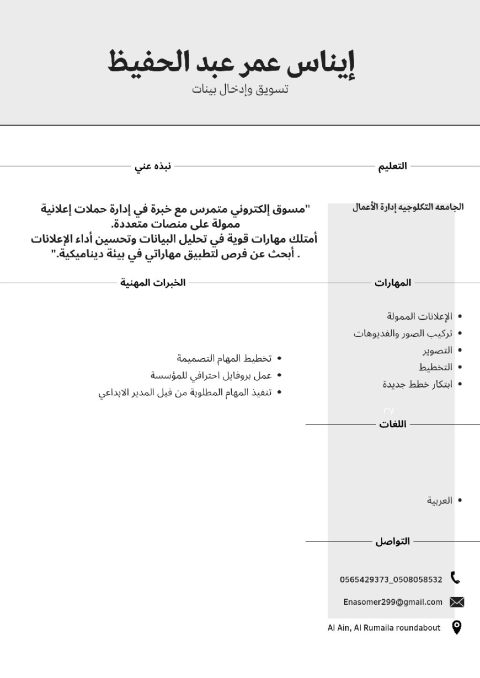أنا منيس، ابحث عن وظيفة في مجال التسويق الرقمي، إدارة اعلانات جوجل، تحليلات جوجل، تحسين محركات البحث (SEO) التسويق عبر محركات البحث (SEM) التسويق عبر وسائل التواصل الاجتماعي (SMM) انشاء المحتوى، انشاء مواقع وورد بريس، التسويق عبر وسائل التواصل الاجتماعي (فيسبوك، انستغرام) حاصل على شهادة في التسويق الرقمي. للتواصل البريد الألكتروني