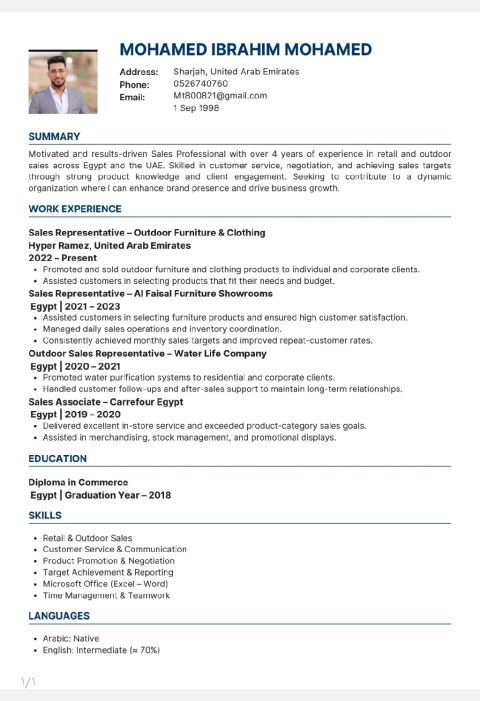 Young Egyptian, 30 years old, currently residing in the UAE. I am seeking a suitable job opportunity in any of the following fields Sales, Car Rental, Customer Service, I am proficient in using computers and office software such as Excel, Word, and car rental management systems I have strong experience in customer handling, office management, and problem - solving I am committed, energetic