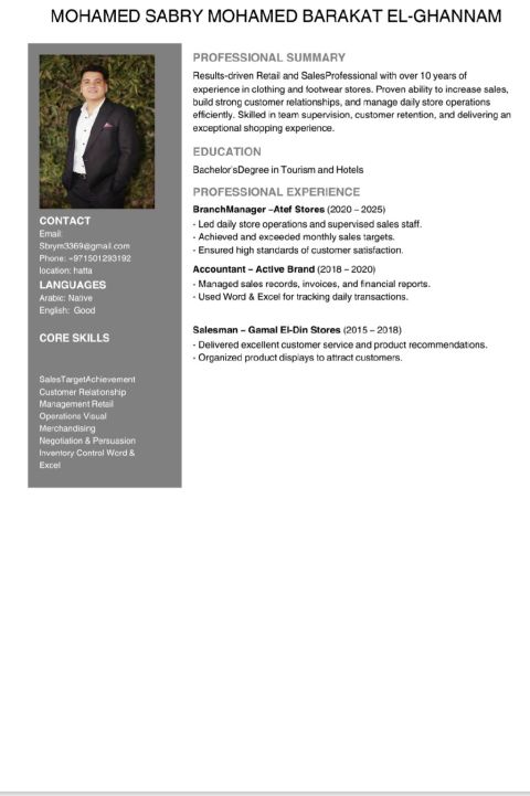 شاب مصري 27 سنة مقيم في عجمان خبرة في مجال مبيعات الملابس والأحذية أكثر من 7 سنوات وابحث عن وظيفة في مجال المبيعات لدى المهارة في اقناع العميل وعرض المنتج بصورة جيده ولباقة في الحديث وحسن المظهر
