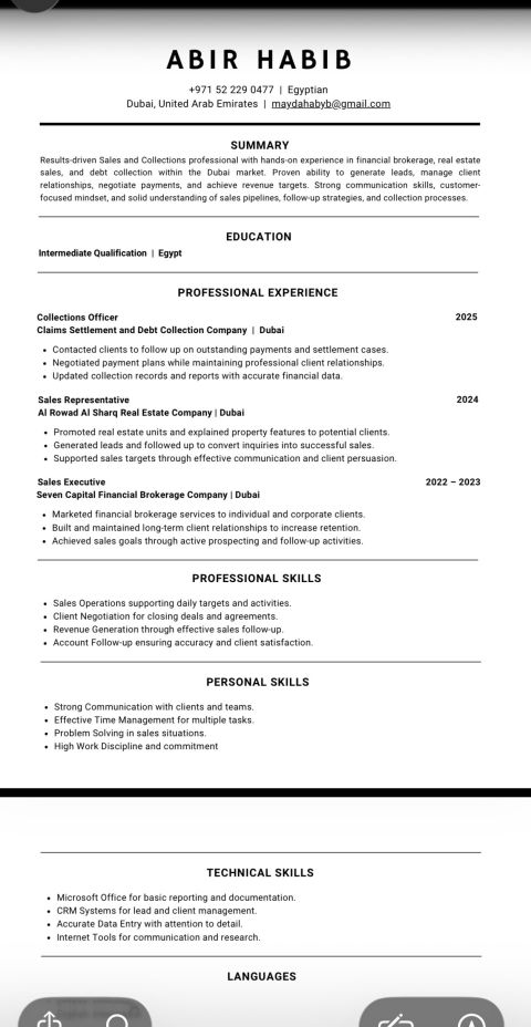 باحثة عن وظيفة في الشارقة أو دبي. لدي خبرة سنتين في مجال السيلز داخل قطاع السياحة، وخبرة سنة في مجال الطيران مع مهارات قوية في التعامل مع العملاء