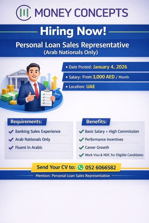 اعلان توظيف - سيلز بنك فرصة عمل مميزة في مجال المبيعات البنكية في أبوظبي نبحث عن بنات طموحات وشباب للعمل في وظيفة Sales بمزايا رائعة راتب ثابت مجز - عمولات شهرية مرتفعة - إقامة متوفرة + اعارة - تدريب مجاني لتطوير مهاراتك - فرص للترقي والتميز اذا كنت تمتلك مهارات التواصل والقدرة على الاقناع فرصتك بدأت الآن أبو ظبي شارع الكترا بناية global tower