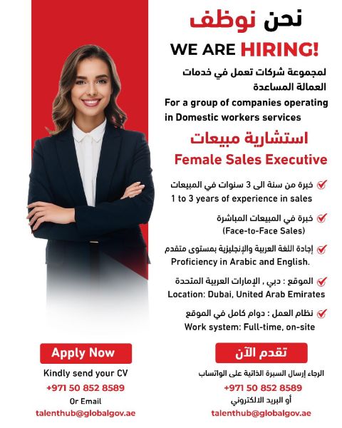 تعلن مجموعة شركات رائدة في خدمات العمالة المساعدة عن فتح باب التوظيف لوظيفة استشارية مبيعات (بنت) female Sales Executive) وفق الشروط التالية المتطلبات خبرة 1 - 3 سنوات في المبيعات اجادة تامة للغتين العربية والانجليزية. نظام العمل دوام كامل (موقع الشركة في دبي) للتقديم يرجى إرسال السيرة الذاتية عبر واتساب 8589 852 50 971 + البريد الألكتروني