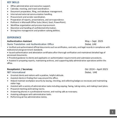 سكرتيرة تنفيذية خبرة أكثر من 12 سنة في الدولة في مجال (سكرتارية تنفيذية وادارة المكتب، خدمة العملاء، استقبال) طباعة عربي وانجليزي مراسلات تجارية الترجمة (العربية - الانجليزية - الفارسية) اجادة لغات (عربي، انجليزي، إيراني، أردو) القدرة على العمل تحت الضغط وإدارة أولويات متعددة تتمتع بخبرة واسعة في القطاعات القانونية، والرعاية الصحية، والتجارية (جادين