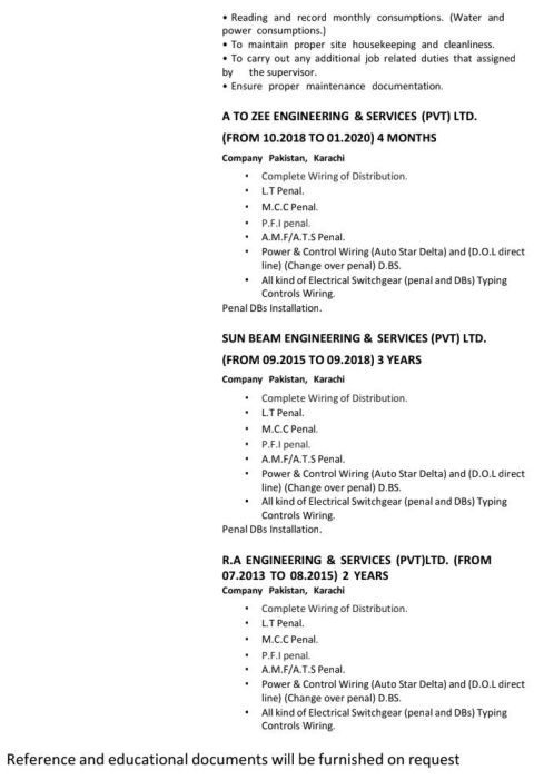 أود التقدم لشغل وظيفة مهندس كهرباء / مشرف كهرباء في مؤسستكم الموقرة. لدي أكثر من 12 عاما من الخبرة المهنية في مجال الكهرباء، منها 6 سنوات في مراكز بيانات اتصالات (أعمال كهربائية) و6 سنوات في أنظمة السويتش جير ولوحات التوزيع الكهربائية (LV, MDB, SMDB, MCC, LT, ATS، نظام ستار دلتا، PFI، وأعمال التوصيلات والتحكم) اللغات الانجليزية، الأردية