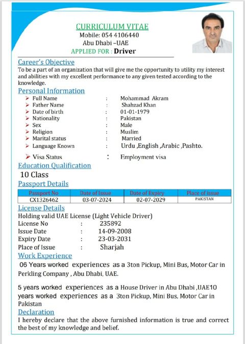 My name is Anwar jan me Age 27 years and my country is Pakistan and I am looking for a driver job with 4 years experience and 3 number manual license. I speak Arabic, Urdu, English, Pashto, and I am currently in Abu Dhabi Al Shahama. If anyone needs a driver, please contact me