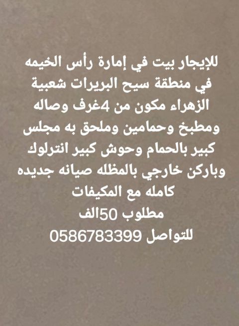 للإيجار بيت شعبي في إمارة رأس الخيمة في منطقة سيح البريرات مكون من 4 غرف وصالة ومطبخ وحمامين وملحق به مجلس كبير بالحمام وستور وحوش وموقف خارجي بالمظلة صيانة جديدة كاملة مع المكيفات مطلوب 50 ألف