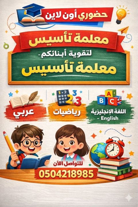 هل تبحث عن مدرس متميز يساعد أبناءك على التفوق معك مدرس متخصص بخبرة أكثر من 10 سنوات في مجال التعليم، أقدم خدمات تعليمية متكاملة بجودة عالية ونتائج ملموسة. تدريس جميع المواد الدراسية اللغة العربية - التربية الاسلامية - الدراسات الاجتماعية تأسيس قوي في القراءة والكتابة تعليم أساسيات الرياضيات بطريقة سهلة ومبسطة متابعة الواجبات والدروس بشكل يومي خريج كلية التربية - خبرة في جميع المناهج