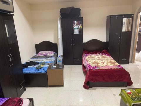 متوفر سكن شباب في الشارقة التعاون قريب من دبي سراير وغرف بأسعار مناسبة نظافة يومية صالة للجلوس سفرة داخل المطبخ للأكل مواقف مجانا