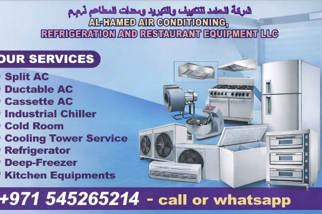 الحل المتكامل للتكييف والتبريد والمطابخ التجارية شركة الحامد للتكييف والتبريد ومعدات المطاعم ذ م خبرة، جودة، وسرعة تنفيذ في مكان واحد نقدم لكم أفضل الخدمات بأعلى المواصفات في جميع أنحاء الامارات سواء للمنازل، المحلات، المصانع، أو المطاعم الكبرى تركيب وصيانة مكيفات سبليت أنظمة الدكت والكاسيت تشيلرات صناعية غرف تبريد وتجميد أبراج تبريد (Cooling Tower) ثلاجات وم
