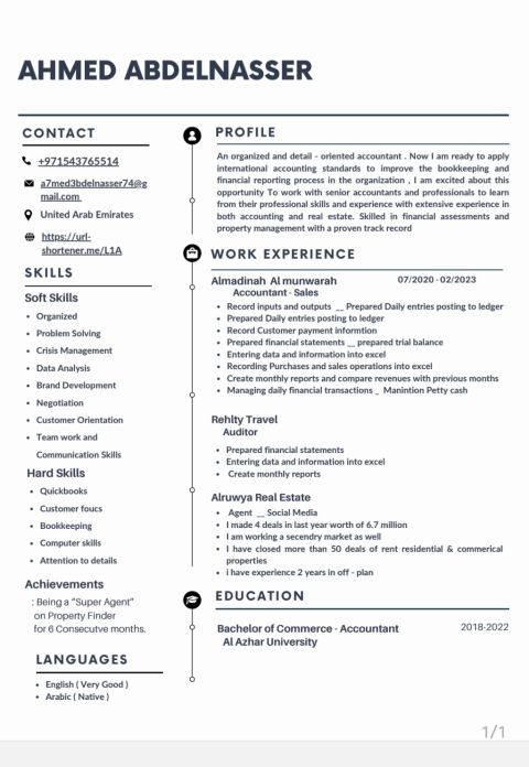 حاصل على شهادة CMA المتوسطة وبكالوريوس تجارة ولدي خبرة عملية في المحاسبة المالية، ومحاسبة التكاليف، والضرائب، والتدقيق. ملم بلوائح ضريبة القيمة المضافة في الامارات العربية المتحدة، وبرامج المحاسبة وبرنامج مايكروسوفت اكسل. ابحث عن وظيفة محاسبية مليئة بالتحديات لتطبيق معرفتي التقنية ودعم عملية اتخاذ القرارات التجارية