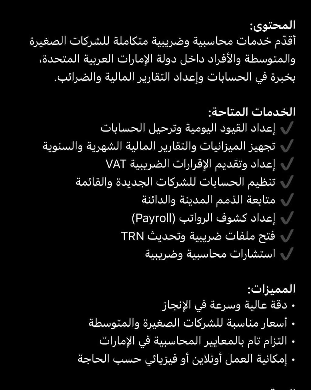 محاسبه محترفه بخبرة سنتين ونصف ذو خبرة واسعة في إدارة الدفاتر المحاسبية، اعداد التقارير المالية، تسجيل ضريبة الشركات وضريبة القيمة المضافة وتقديم اقراراتهم ومعالجة الملفات الضريبية بكل دقة وكفاءة. داخل إمارة عجمان والشارقة ودبي