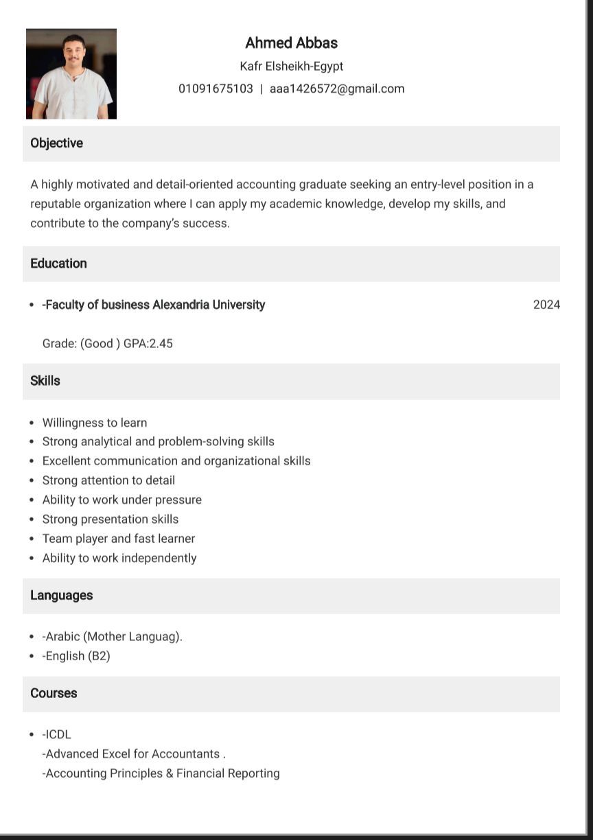 محاسب مبتدئ ابحث عن فرصة عمل داخل الامارات. عندي معرفة بأساسيات المحاسبة واعداد التقارير المالية، وملتزم في الشغل وجاد في التعلم والتطور. جاهز للالتحاق فورا