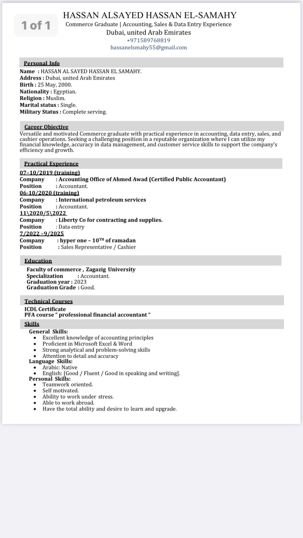 مساعد محاسب ومدخل بيانات وكاشير اشتغلت في مجال شركات المقاولات والخدمات البتروليه ومدخل بيانات ومكاتب المحاسبه القانونية عمل الفواتير وتحليل البيانات والميزانيات. وفي مجال الهايبر ماركت بداية من تحميل وتنزيل وتنسيق المنتحات وقسم الجبن وقسم العطارة والكاشير