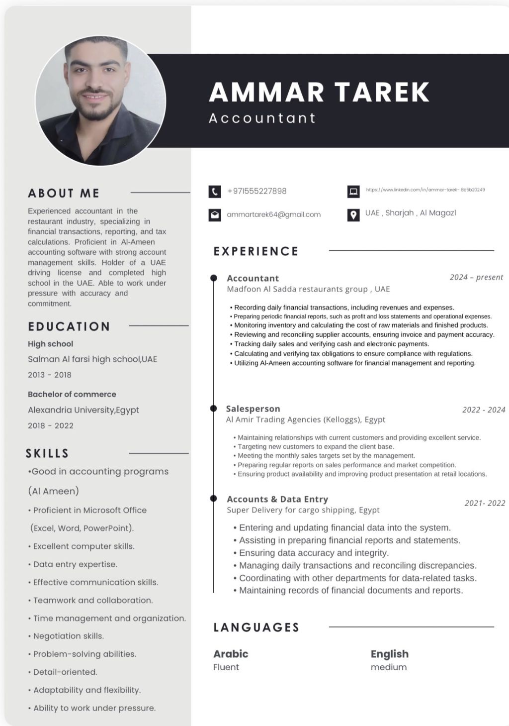 محاسب جاهز للعمل الاضافي من 7 مساء حتى 2 أو 3 صباحا عمري 27 عام اعمل حاليا محاسب في سلسلة مطاعم داخل الامارات، وينتهي دوامي الساعة 6 مساء. ابحث عن عمل اضافي من الساعة 7 مساء حتى 2 أو 3 صباحا. متاح اشتغل في القيادة (امتلك رخصة قيادة اماراتية، ولدي خبرة ممتازة بقوانين وطرق دولة الامارات) ادخال البيانات. أي وظيفة مناسبة لساعات المساء المتأخرة. للتواصل واتساب / اتصال