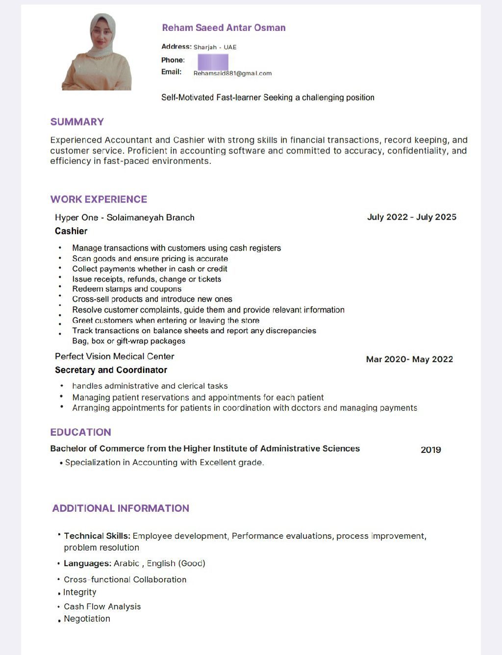 جميعا الاسم / رية أم سعيد الجنسية / مصريه العمر / 29 سنة بفضل الله المؤهل / بكالوريوس تجارة العنوان / الشارقة النهدة اللغة / 30% محجبة الخبرات / اشتغلت كاشير 3 سنوات في مصر في هايبر زاي / اشتغلت استقبال ب مركز طبي سنتين في مصر اشتغلت استقبال في جيم في الشارقة لمدة 6 أشهر الجيم كان عام لي إقامة وحاليا أنا معيا فترة سماح شهر وبدور على شغل ياريت الى قدامه شغل ليا يكون شاكر