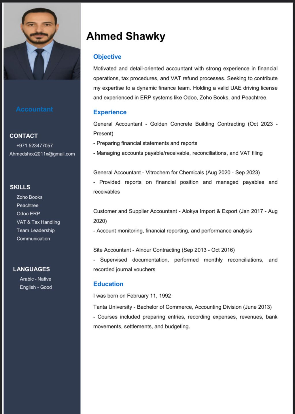 I am currently open to new opportunities as a General Accountant in the UAE. Experienced in VAT, financial reporting, AP/ AR, and ERP systems. Kindly find my CV attached