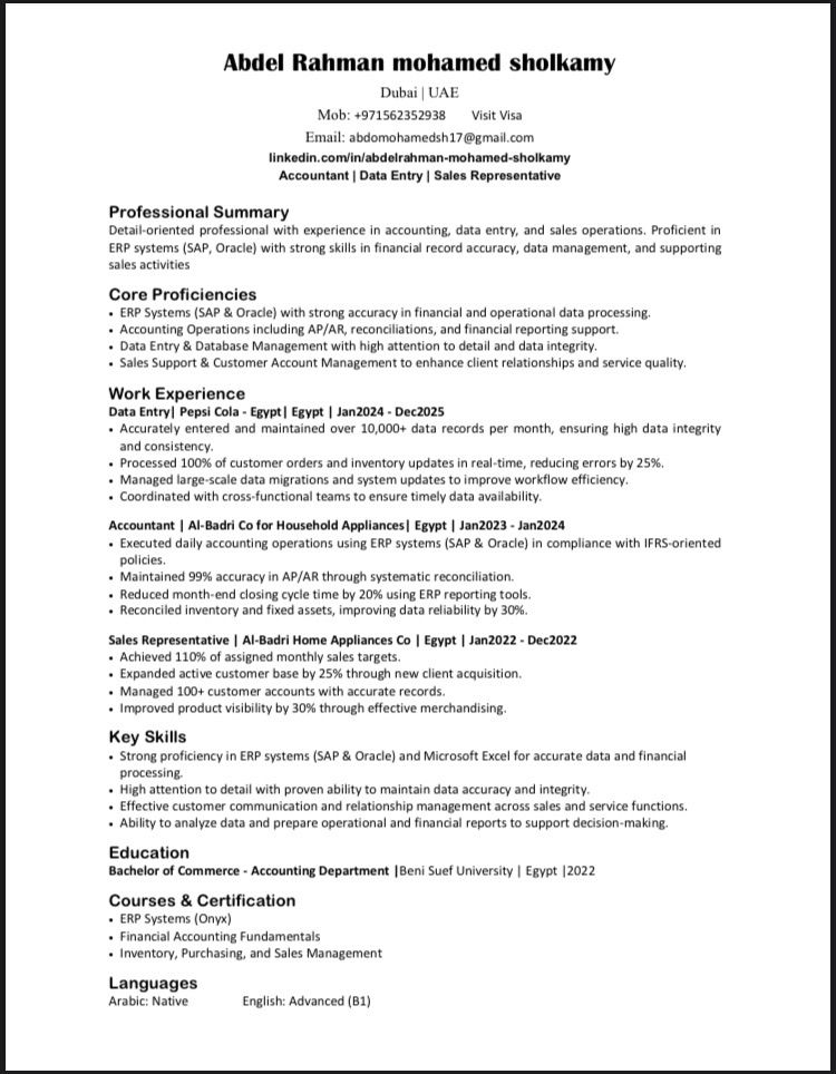 محاسب فيزا زيارة اشتغلت داتا انتري سنتين في شركة بيبسي كولا مصر فرع المنيا الجديدة اشتغلت ع سيستم (اوراكل - والساب) أجيد برامج مايكروسوفت (word - Excel) موجود في دبي ديرة يمكنني التنقل في أي امارة معيا ليسن مصري خاصة
